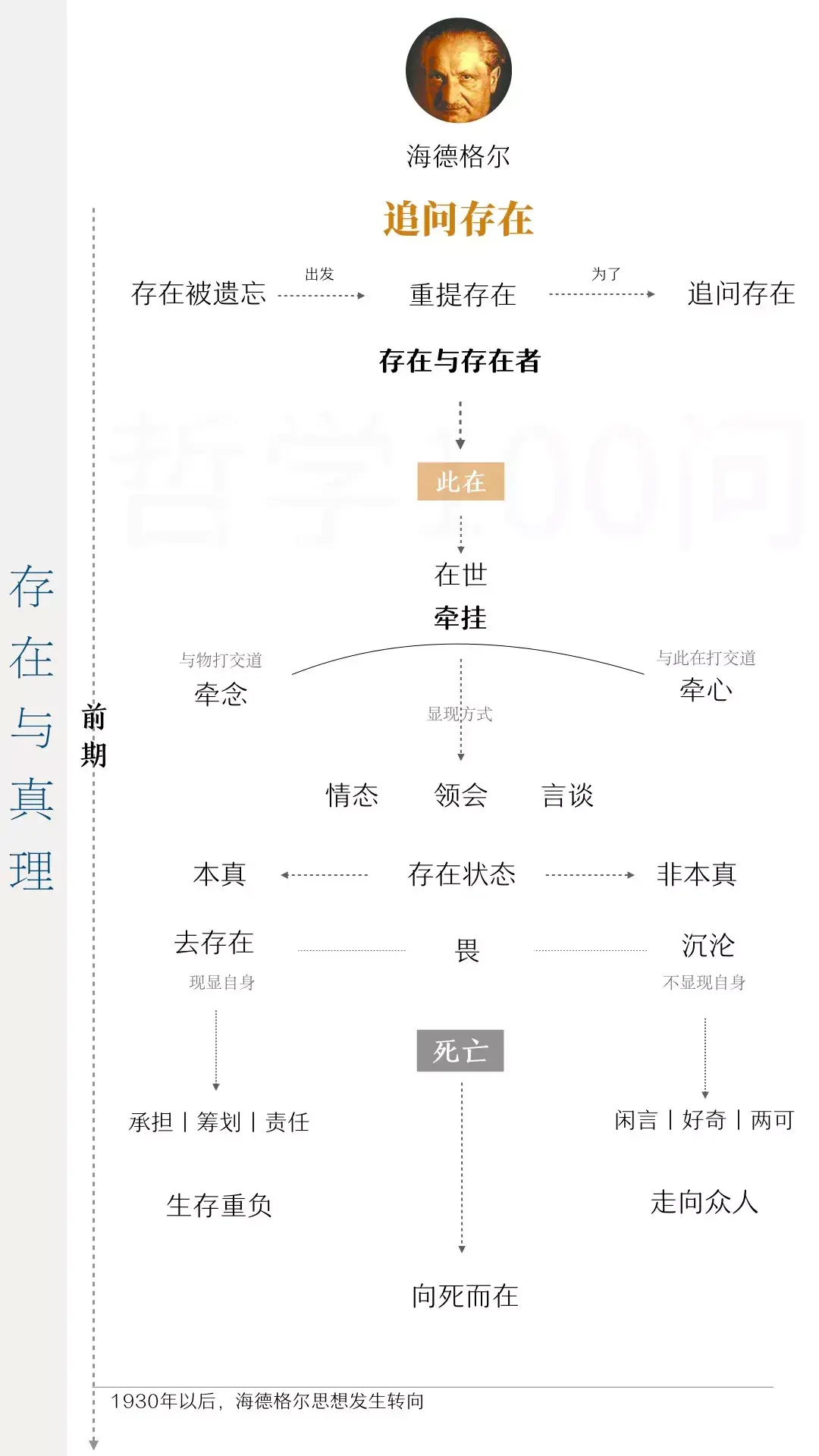 海德格尔将“存在”与“存在者”加以区分,向西方2000多年来传统的形而上学发起挑战。通过此在的分析,揭示出人生在世的本质解构:人的牵挂、人的本真与非本真、人的沉沦、人的畏与死亡。