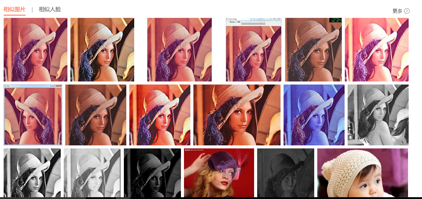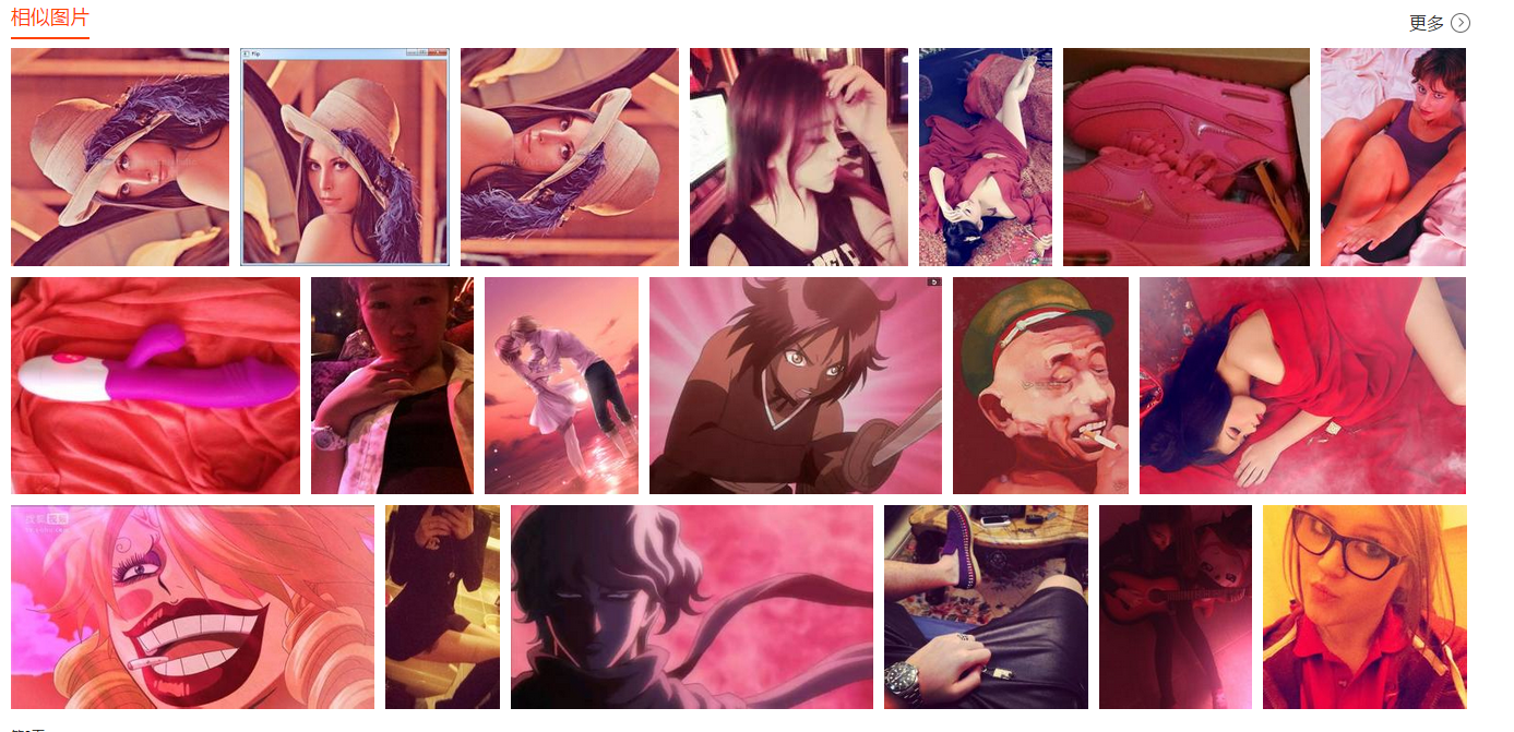 (2) 图c是在图b的基础上加上了一个RGB颜色分布,比较b和c的检索结果,发现检索出来图片的结构都比较相似,但是,后者明显比前者多了颜色信息,这说明百度在进行图片检索时,RGB颜色的分布也是检索的依据之一;