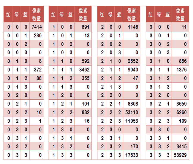 任何一种颜色都是由红绿蓝三原色(RGB)构成的,所以上图共有4张直方图(三原色直方图 + 最后合成的直方图)。将0~255分成四个区:0~63为第0区,64~127为第1区,128~191为第2区,192~255为第3区。这意味着红、绿、蓝分别有4个区,总共可以构成64种组合(4的3次方)。任何一种颜色必然属于这64种组合中的一种,这样就可以统计每一种组合包含的像素数量。