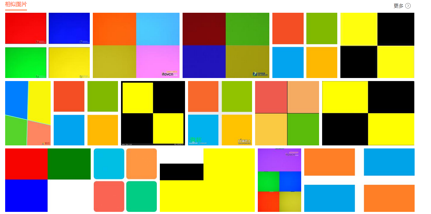 (3) 原图d和原图e唯一的差别就是色块的位置改变了,但是检索出来的结果并不相同,说明百度进行图像检索时应该也是考虑了颜色在空间位置上的分布信息的。