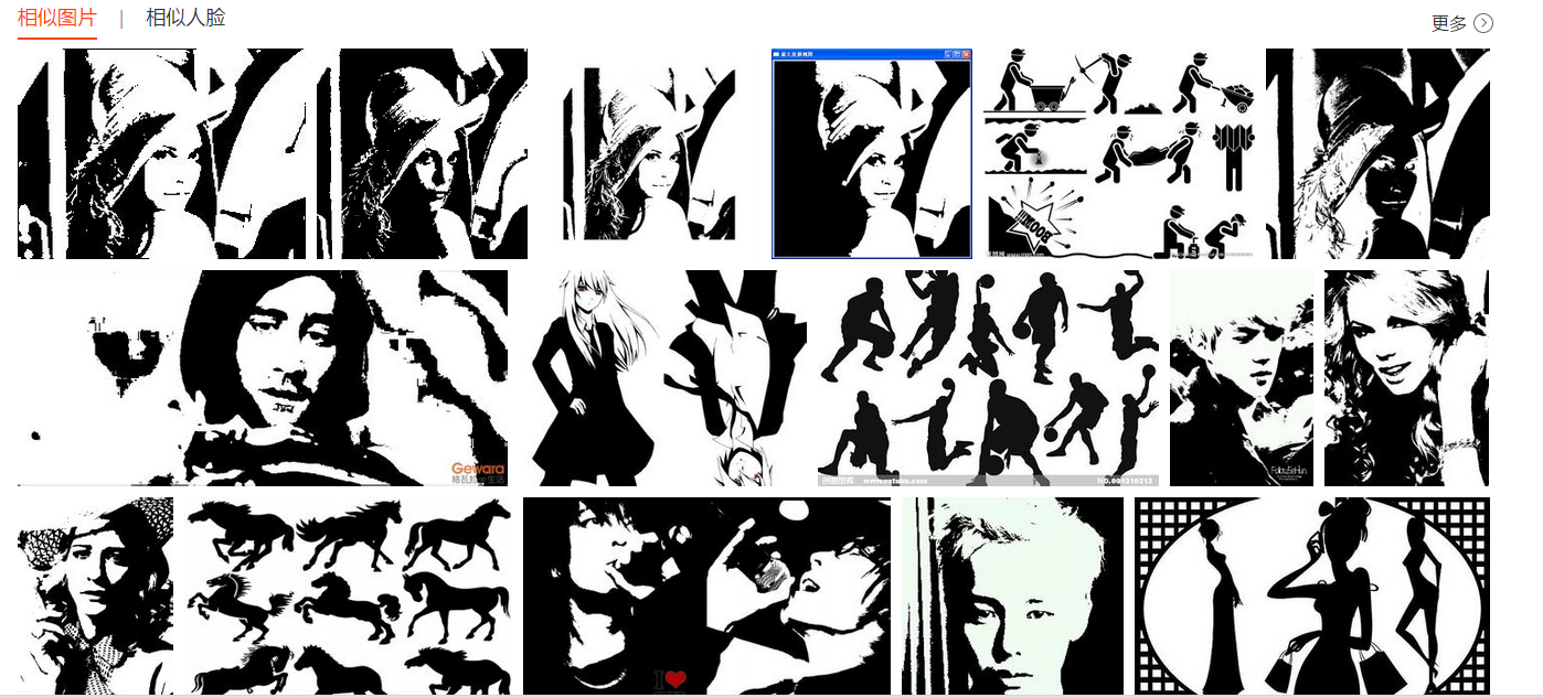 (1) 图f和图h唯一的区别是f是彩色图像,h是它的二值图像,但是我们发现他们的检索结果有很大的差别,彩色图像检索出来依然是彩色图像,二值图像检索出来也都是二值图像,至少可以说明百度图片检索不可能只靠取阈值分割图像来作为检索依据;