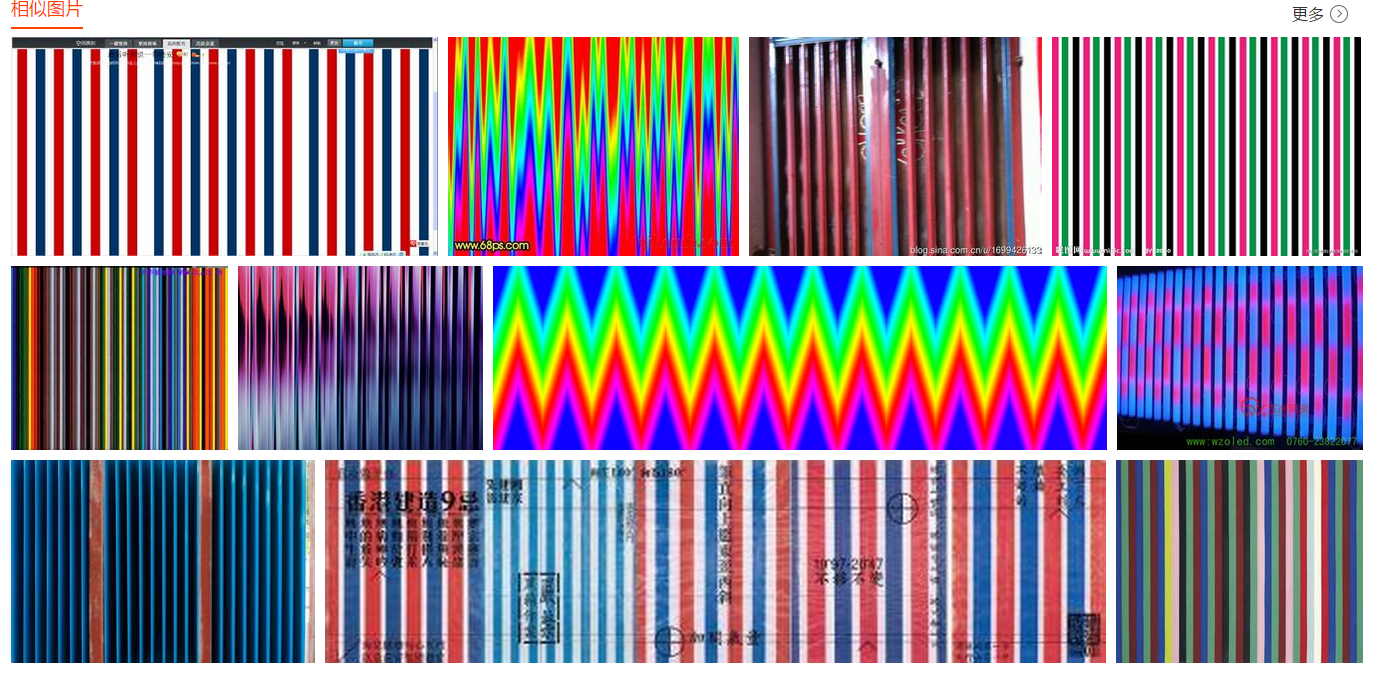 (2) 原图d和原图e只是改变了一下色块的位置,所以如果做它们的颜色分布直方图应该是完全一致的,但是这两张图片的检索结果很相似但是并不完全相同,因此基本可以判断百度图像检索肯定不可能只采用颜色分布直方图来进行检索;