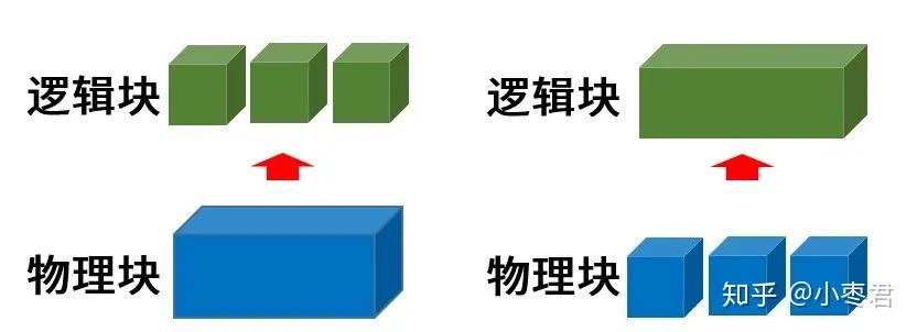 为了方便管理,我们可以将硬盘这样的物理块设备,分割成多个逻辑块设备。或者,我们也可以将多个物理块设备,组合成一个容量更大的逻辑块设备。