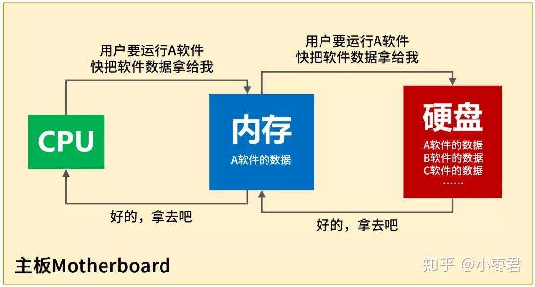 我们知道,计算机的三大核心硬件,分别是CPU(中央处理器)、内存(Memory)和硬盘(Hard Disk)。CPU负责运算,硬盘负责存储。而内存,是CPU和硬盘之间的桥梁。用于暂时存放CPU中的运算数据。