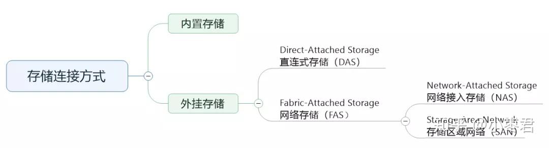 外挂存储分为两种,一种是直连式存储(DAS,Direct Attached Storage),还有一种是网络存储(FAS,Fabric Attached Storage)。
