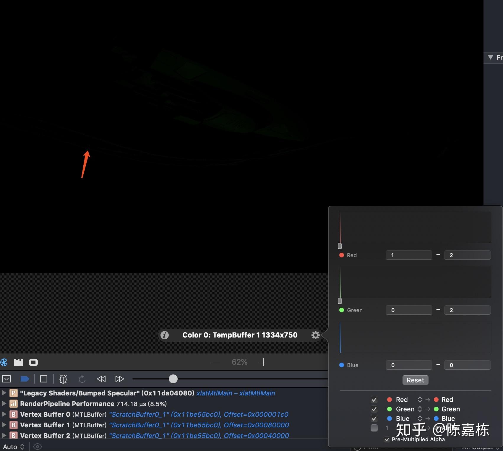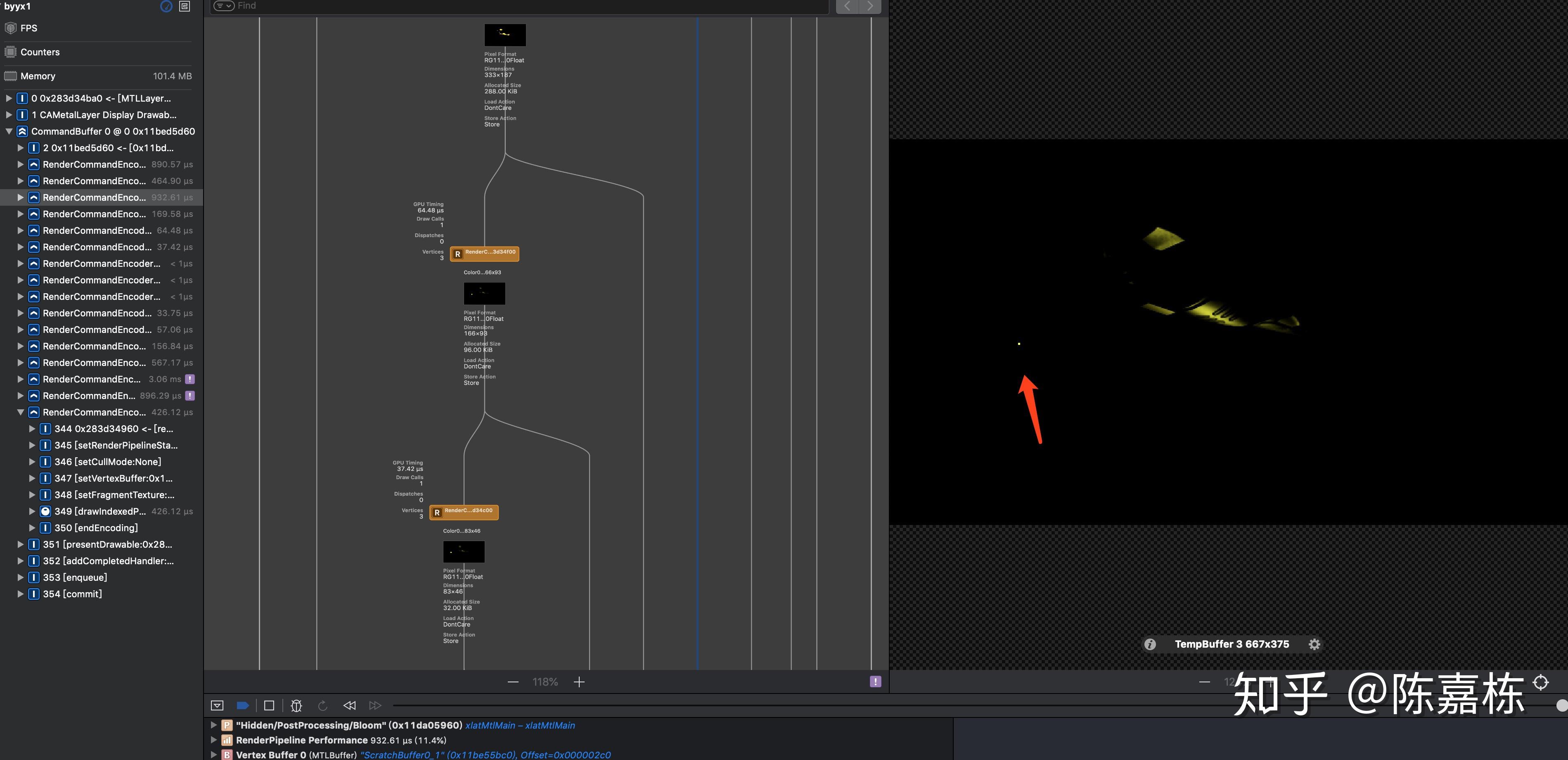 如你所见,在Bloom的Downsample过程开始时,有一个看起来不正常的像素。此时我们可能已经找到了目标。 但是在Bloom过程中,纹理已被Downsample。 因此为了找到原始像素,让我们来探索一下在Bloom之前的render encoder,以查看是否还有其他有价值的发现。