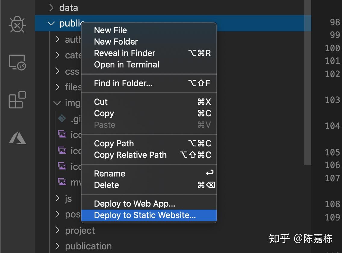 创建Azure存储帐户后,我们需要将网站文件部署到该存储帐户。在VS Code中打开Files explorer,你可以找到一个名为public的文件夹,这是从工程生成的真实的网站文件。然后右键单击该文件夹,然后选择“Deploy to Static Website”。