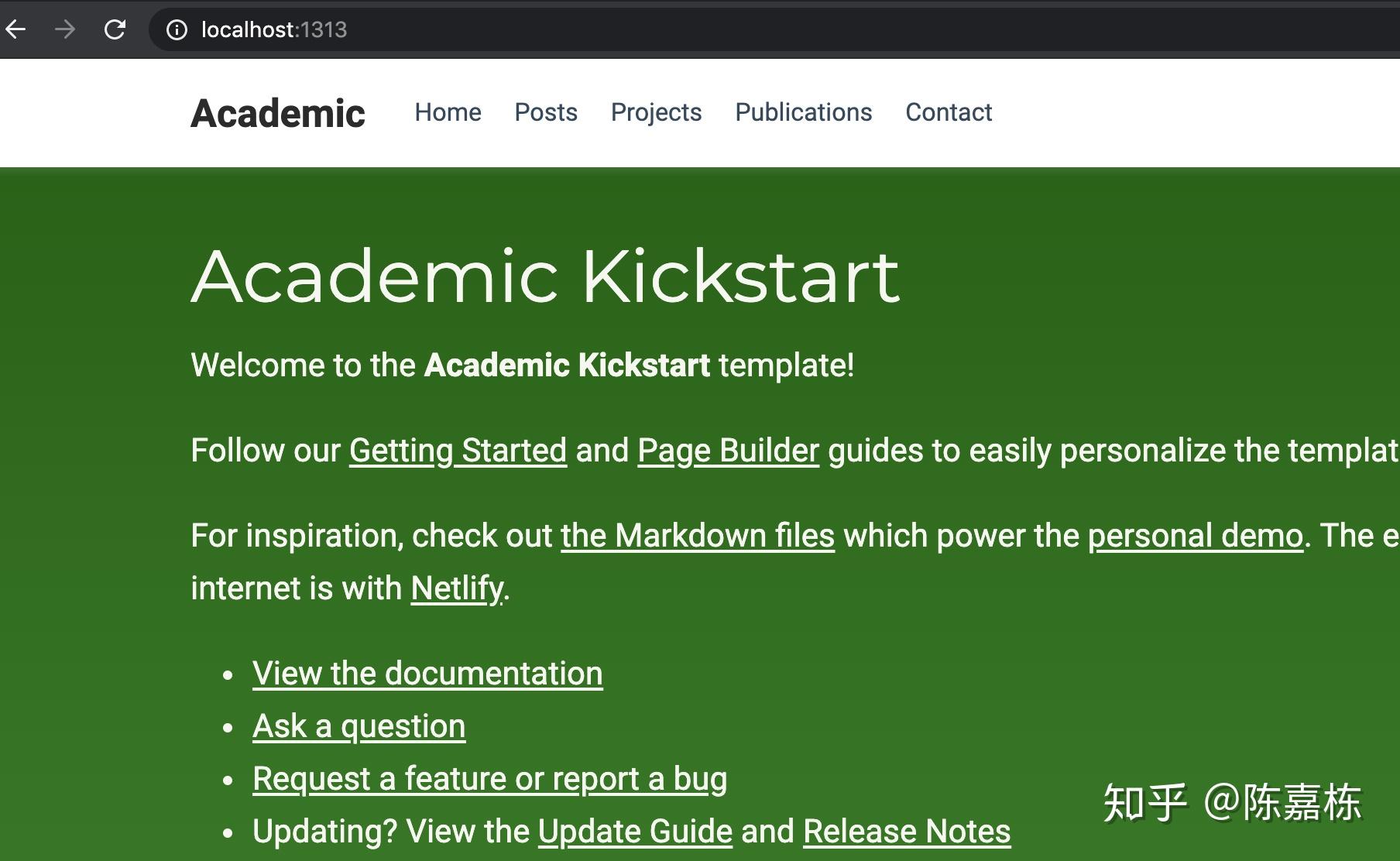 这样,我们就在本地运行了一个使用Academic主题的网站,同样在浏览器中访问http://localhost:1313/即可。