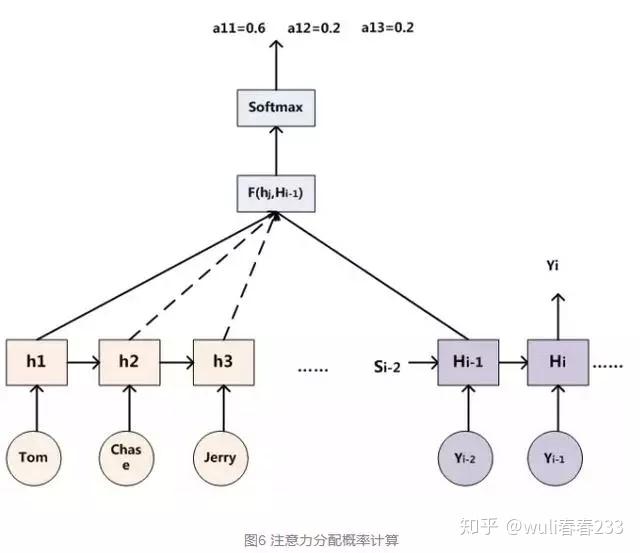 引入attention后,每个单词都会有一个权重:(Tom,0.6)(Chase,0.2) (Jerry,0.2)