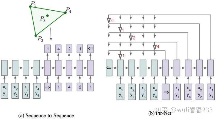 为啥叫pointer network呢?对于凸包的求解,就是从输入序列{P1,....,P1000}中选点的过程。选点的方法就叫pointer,他不像attetion mechanism将输入信息通过encoder整合成context vector,而是将attention转化为一个pointer,来选择原来输入序列中的元素。