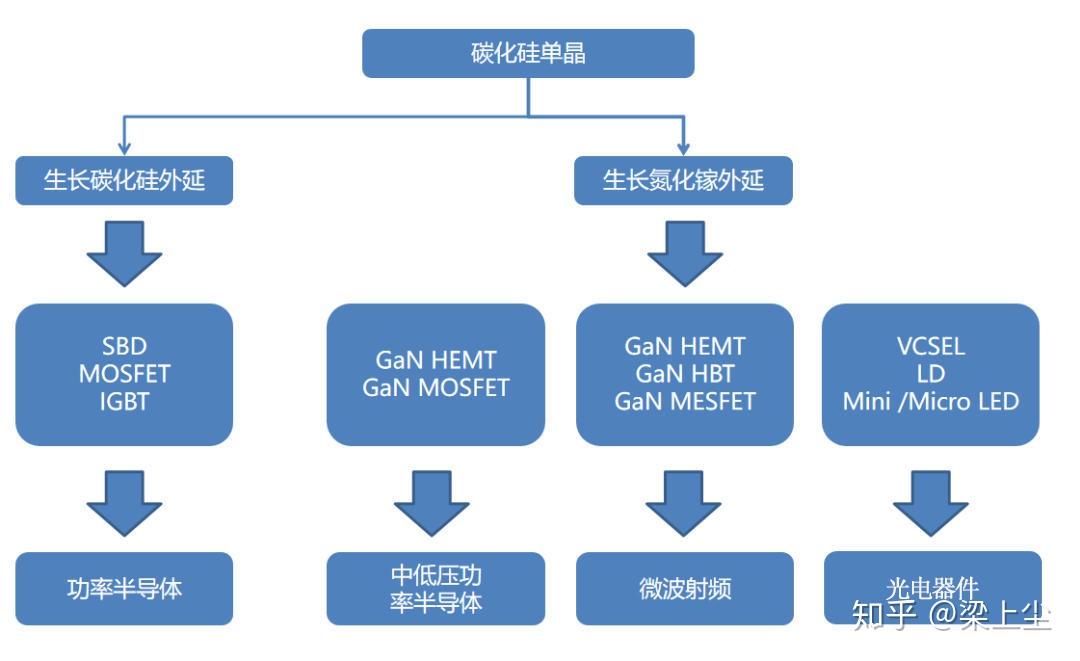 目前碳化硅和氮化镓这两种芯片,如果想最大程度利用其材料本身的特性,较为理想的方案便是在碳化硅单晶衬底上生长外延层。即碳化硅上长碳化硅外延层,用于制造功率器件;碳化硅上长氮化镓外延层,可以用来制造中低压高频功率器件(小于650V)、大功率微波射频器件以及光电器件。