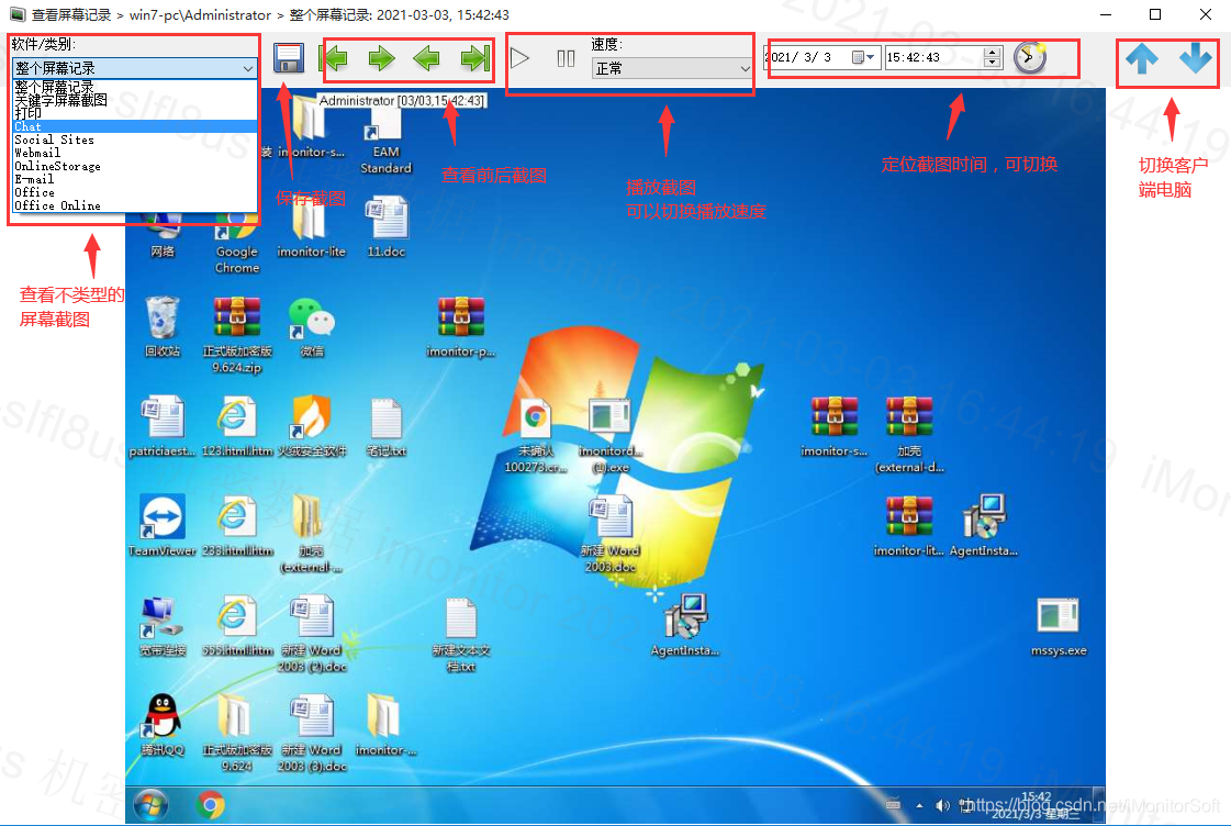 屏幕记录这个功能可以设置的时间间隔来进行截取整个桌面或者部分软件画面,可分类查看全屏记录,聊天记录,邮件记录等等。也可以播放截屏,调节播放速度,定位到某一时刻的截屏,切换监控客户端。如下图所示: