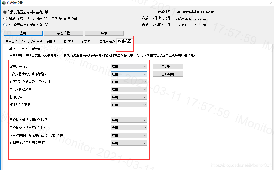 报警的条件可以在客户端设置里进行设置,当被监控电脑进行违规操作时,就会触发警报,产生报警记录。