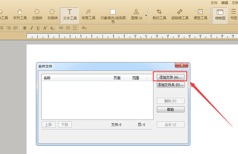 接着点击合并文档窗口面板右侧的添加文件,依次添加已转成PDF的Word文档,图片以及PDF文档,或者可以先按顺序整理好所有文档后,保存在同一文件夹,直接添加整个文件夹即可。