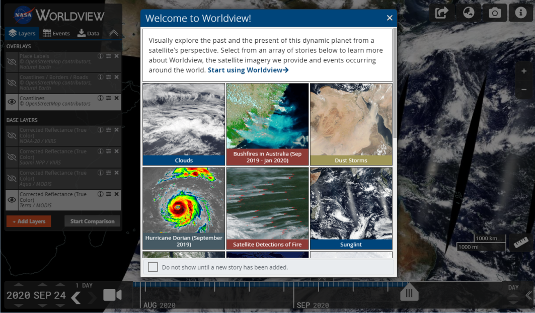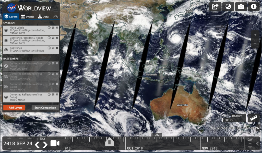 目前在Worldview平台上可以通过底部的时间轴和日期选择按钮选择要查看的数据。