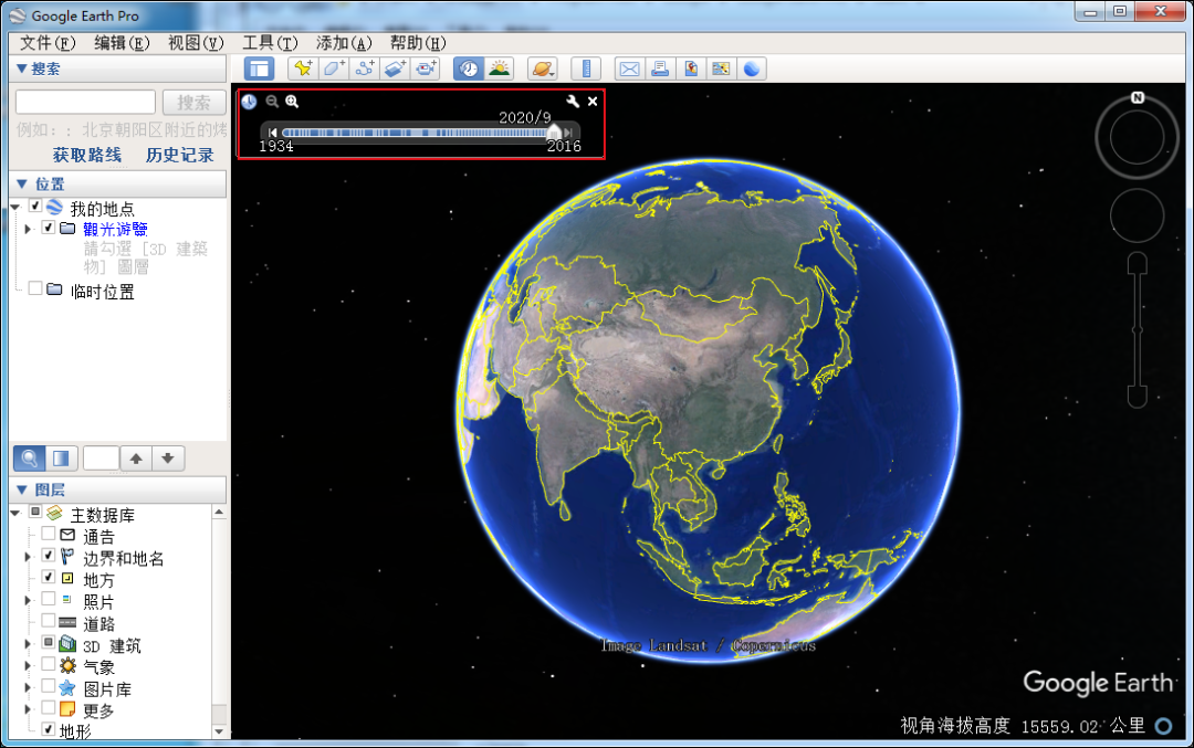 谷歌地球上的影像数据应该是目前最为丰富的,可能没有之一。在Google Earth Pro通过拖动时光机功能可以查看不同时期的历史数据。