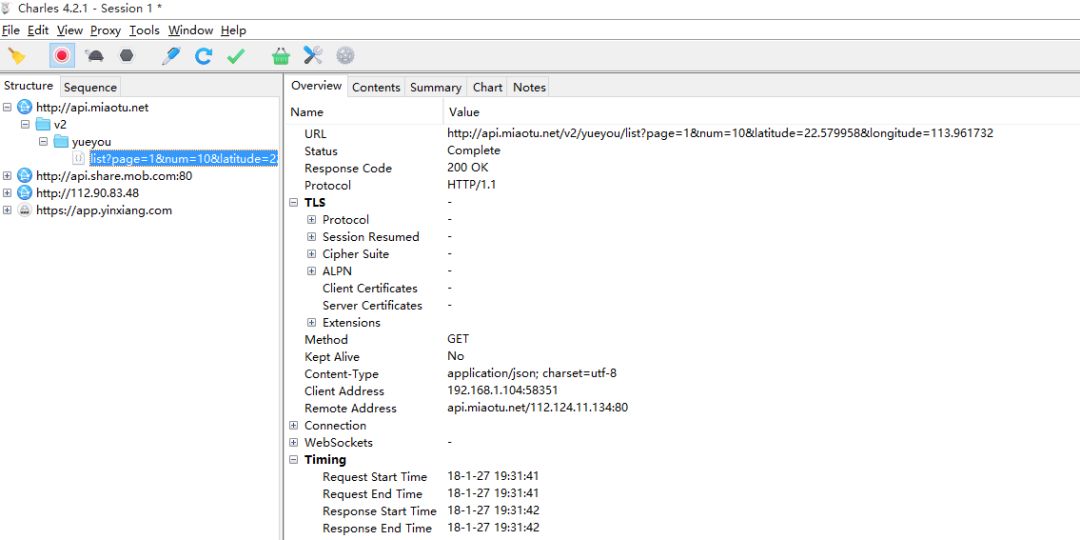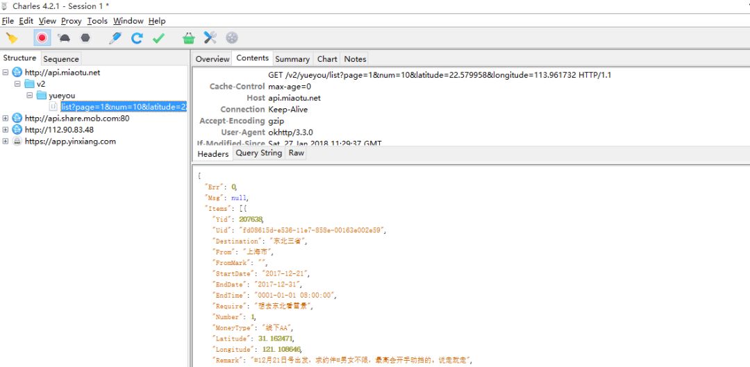 抓取数据分为三步。先清空所有的数据,然后点击开始按钮,最好操作我们的手机客户端,要哪个页面的数据,就跳转到哪个界面 。我们看到,下图,当我们操作的时候,每加载一次数据,都会被我们的抓包工具Charles截获到,显示出来 。