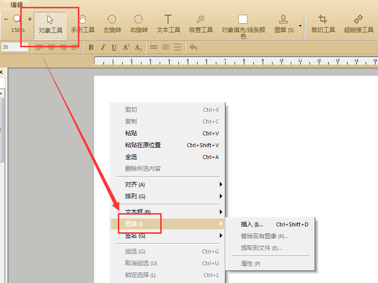 接着再选择菜单栏中的“对象工具”后,在文档页面任意处右击并选择图像中的插入,将图片插入到PDF文档中,进行适当调整后,将文档保存一下就是PDF格式了。