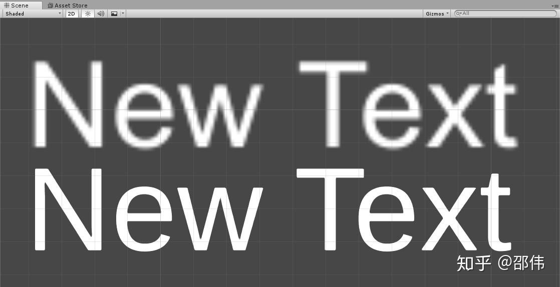使用TextMeshPro能够获得更多的文字控制自由度,并且能够有效防止文字边缘模糊。如下图所示,第一行文字通过"Create > UI > Text"命令创建,第二行文字通过"Create > UI > TextMeshPro - Text"命令创建。