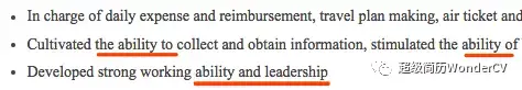 请注意,动词后面不是用来加自我总结的,Developed了什么产品,而不是你的什么ability。