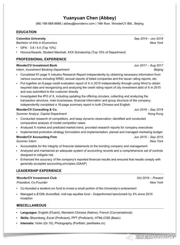 头部:和专业的中文简历一样,基本信息放在头部,只需要写姓名、联系方式就可以。不要放头像,也不要写年龄、性别等等其他信息,会显得不专业。