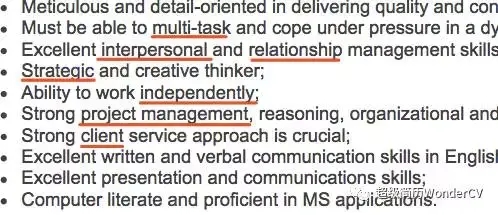 可以看到以上这些关键词:多任务处理,好的人际关系,独立工作,战略思维,项目管理,客户沟通。那么在简历中就应该根据自己做过的事情加上这些关键字,比如: