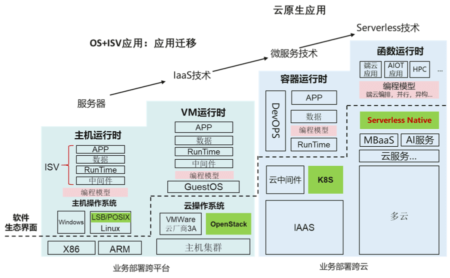 云计算的兴起,在CPU硬件能力大力发展之后,得益于OS+ISV的软件生态和虚拟化技术的成熟。云计算巧妙地延续OS+ISV生态,把ISV可以无缝地迁移到云上。云vendor利用虚拟化技术,对客户提供IAAS服务。满足客户:1、应用软件运行条件没有发生变化;2、不用维护物理主机,只需要关注应用软件本身。