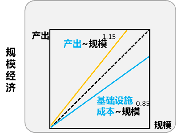 首先,可以解释为规模经济性,简单地说,随着生产规模(云计算)扩大,平均单位产出(服务收益)成本(基础设施成本)趋于下降。英国的杰弗里·韦斯特研究城市的人口和产业的发展规律,总结为规模经济体的产出呈超线性,而成本遵循亚线性规律,如下图所示。