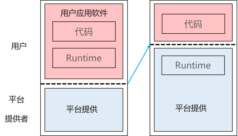函数计算这个层次的抽闲,借助于终端用户或IOT等事件型的应用,将代码和其运行时分离,云厂商提供函数代码的运行时及其物理资源。如下图所示,平台提供商获得了软件栈最大可控制的范围,而用户只需要关注其代码。因此,函数粒度的应用,让平台提供商获得了最大的技术空间,基于这个空间,让云计算的规模成本进一步得到下降,所以Serverless技术是云厂商必选的选择项。