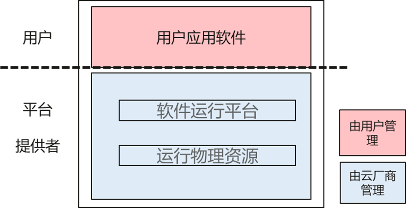 首先,从云计算的服务形态来看,对于企业应用及其基础设施,现在变成了用户和基础设施提供商两个层次,如下图所示。这个逻辑层次的划分很重要,在软件生态中原来基础设施平台和应用软件都是由用户自己管理和维护,这时出现了专业的平台提供者的角色,来提供基础设施。