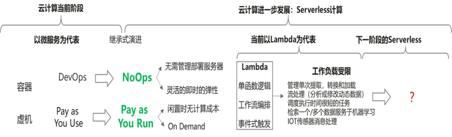 Serverless当前相对比较正式的定义(CNCF白皮书)有几个特征:是云计算形态的进一步发展,相对于当前云计算,它带来两个关键好处:NoOPS和Pay as You Run。现阶段Serverless技术的实现形态,以AWS发布的Lambda为代表,其他还包括微软Azure Function,谷歌Cloud Functions等。在2019年伯克利发布《Cloud Programming Simplified》展望中,把Serverless定义为云计算的下一代计算范式。云计算从微服务技术主导到Serverless技术的演进,我们看看云计算的本质就可以比较好的理解这些技术背后的逻辑,也就能理解为什么伯克利继成功断言云计算的兴起之后,把目光聚焦在Serverless技术上呢?