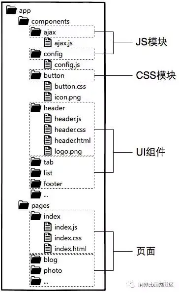 - 每个组件对应一个工程目录,组件所需的各种资源都在这个目录下就近维护;