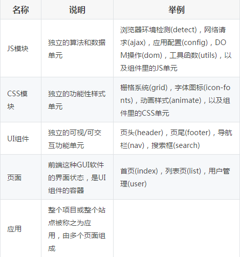 结合前面提到的模块化开发,整个前端项目可以划分为这么几种开发概念: