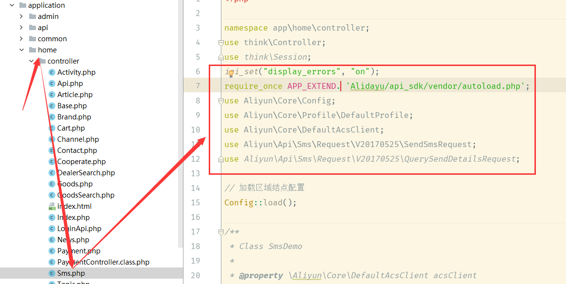 定义后,我们就可以引入SDK加载路径了,我们在home控制器新建sms控制器,然后引入SDK需要的命名空间如图