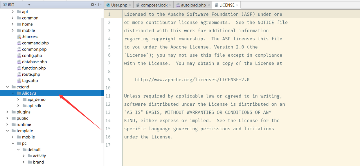 1.下载SDK,接口在阿里大鱼官网,本人使用版本为2017年10月下载,不保证后续官方SDK会相同,本人SDK版本地址百度云:http://pan.baidu.com/s/1eRPzmro 密码:oy7c;下载后放到TP5扩展目录extend下,如图: