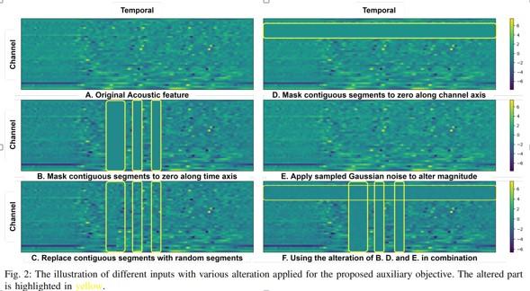 还有一个基于Mockingjay改进的模型 —TERA (Transformer Encoder Representations from Alteration)[9],是在输入端上,对输入进行了一些alteration,从而达到提升预训练模型效果的作用。下图是TERA如何进行输入的alteration的示意图。Alteration主要分为3种,在时间维度上mask,在特征维度上mask,以及对于整个segment加一些高斯白噪声。