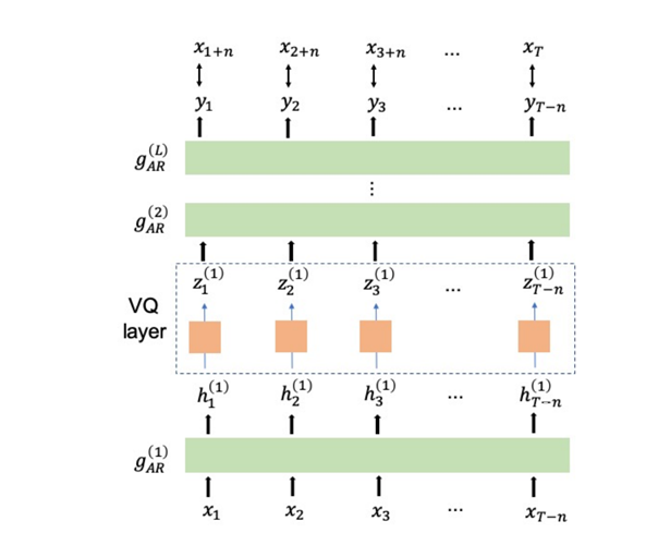 APC(Autoregressive Predictive Coding)[3] 以及它的改进,VQ-APC(Vector Quantization- Autoregressive Predictive Coding)[4] 也是一组基于自回归的预训练语音模型,它们的模型架构如下图所示。APC没有VQ-layer,而VQ-APC添加了一个VQ layer。