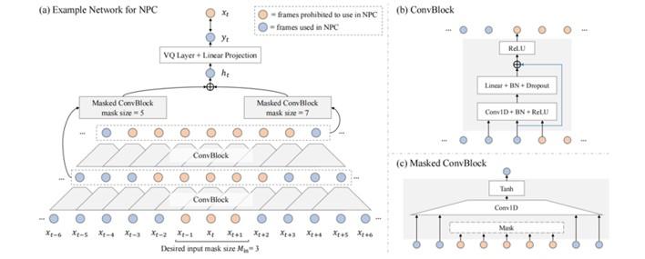 输入是MFCC (80dim),但NPC模型训练时,输入模型的并不是整个sequence,它只需要输入被mask掉的帧前后的一些帧(例如前后各10帧),而被mask掉的帧一般为3帧。Mask掉3帧而不是1帧,可以防止模型直接复制mask 点的相邻点(xt-1,xt+1)的值作为当前时刻输入xt的预测值,从而防止预测值yt并没有相对于xt的信息增益。被mask的input输入模型后,经过几层ConvBlock,每层ConvBlock也会mask中间的帧,且会层层递增,目的是防止输出yt见到任何mask size内的数据。经过几层ConvBlock后的数据会加到一起得到ht(当前时刻做VQ之前的hidden representation),ht再经过一个VQlayer和一个linear layer,最后预测中间帧xt,loss用L1 Loss。这个模型的效果比autoregressive的模型都要好,况且可以显著的减小模型的大小。