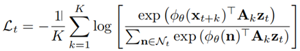 首先,语音信号被分成段输入到CNN模型,用于抽取特征,CNN层的输出Z再作为GRU层的输入,拿到带有时序信息的输出C,然后用当前时刻t的带有时序信息的Ct(见过序列前面的信息),来预测后续k个时刻的CNN层输出Zt+k。Loss的是一个contrastive loss,它的公式如下图所示。