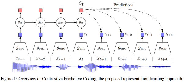 CPC(Contrastive Predictive Coding)[1] 是预训练语音模型中较早提出的模型。它的模型架构如下图所示。