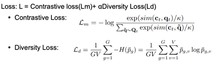 首先,音频也是分段输入CNN层提取特征,然后一方面输入到VQ层,另一方面随机mask掉一些帧然后输入到Transformer层提取context representation C。训练的loss如下图所示。
