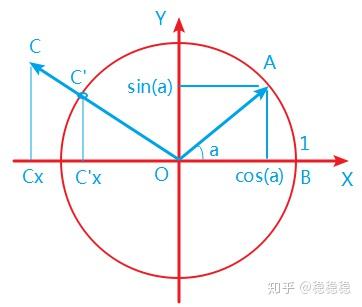 所以不管任何向量,我们要转换为单位向量,只需要计算出这个向量的余弦和正弦值就可以了。例如向量OC我们将其转换为单位向量就是OC’,因为OC’的长度为1,所以向量OC’的坐标就是(cos(c),sin(c)),c为OC和x轴正方向的夹角。而OC’和OC的方向是重合的,他们与x轴正向夹角相等,也就是我们只需要计算向量OC的cos(c)、sin(c)即可。