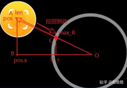 如何将摇杆拖回到灰色圆环处,无非是要求出在C点的坐标。根据△ODC和△OBA为相似三角形,有OD:OB = OC:OA,也就是?:pos.x = max_R:len。