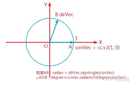 代码pos就表示B点的坐标,pos和原点(0,0)相减,得到向量OB,也即代码中的dirVec,弧AB为radian,转换为角度degree。
