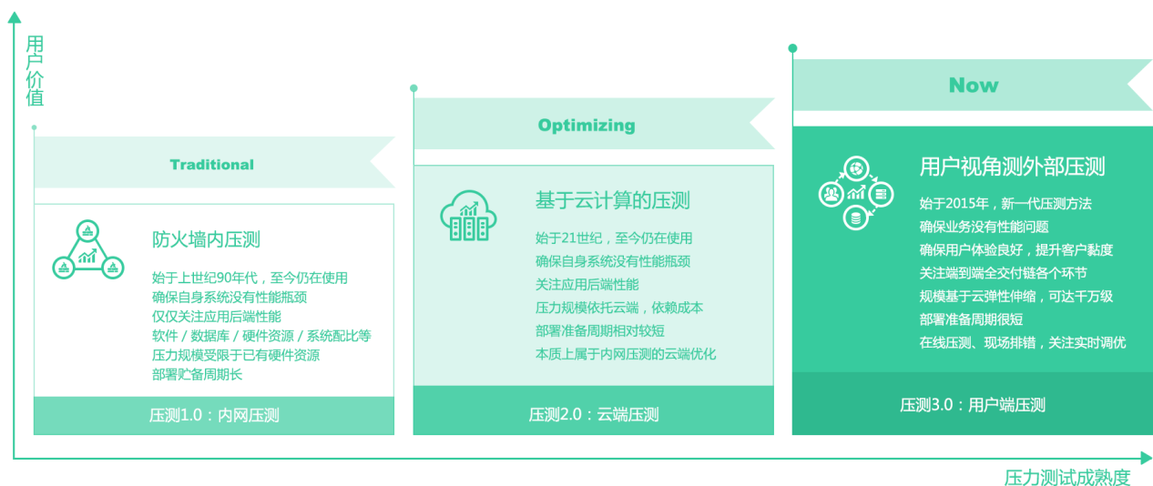 以上是市面上比较常见的十款压力/负载/性能测试工具,其中以Jmeter和Loadrunner 为代表的大部分产品属于传统防火墙内的压测,适用于测试内网系统硬件资源以及服务、数据库在并发条件下的性能表现。阿里云PTS和CloudTest为代表的第二代压测产品把压测机迁移到云端,通过云资源在防火墙外部生成规模并发,有效降低了压测的成本与准备周期,提高了效率。只是由于压测点限制,国外或阿里的云压测产品,很难对国内应用,特别是非阿里环境部署的应用发起有效测试。