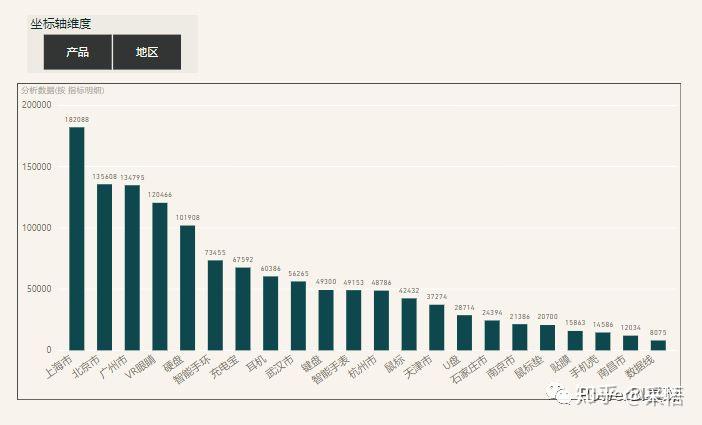假设要分析的数据为销售额,分别从产品和地区两个维度进行分析,要实现的效果是,如果选择的是产品,则坐标轴是各个产品的名称,对应的是各个产品的销售额;如果选择的是地区,则坐标轴为城市,展现的是各个城市的销售额。