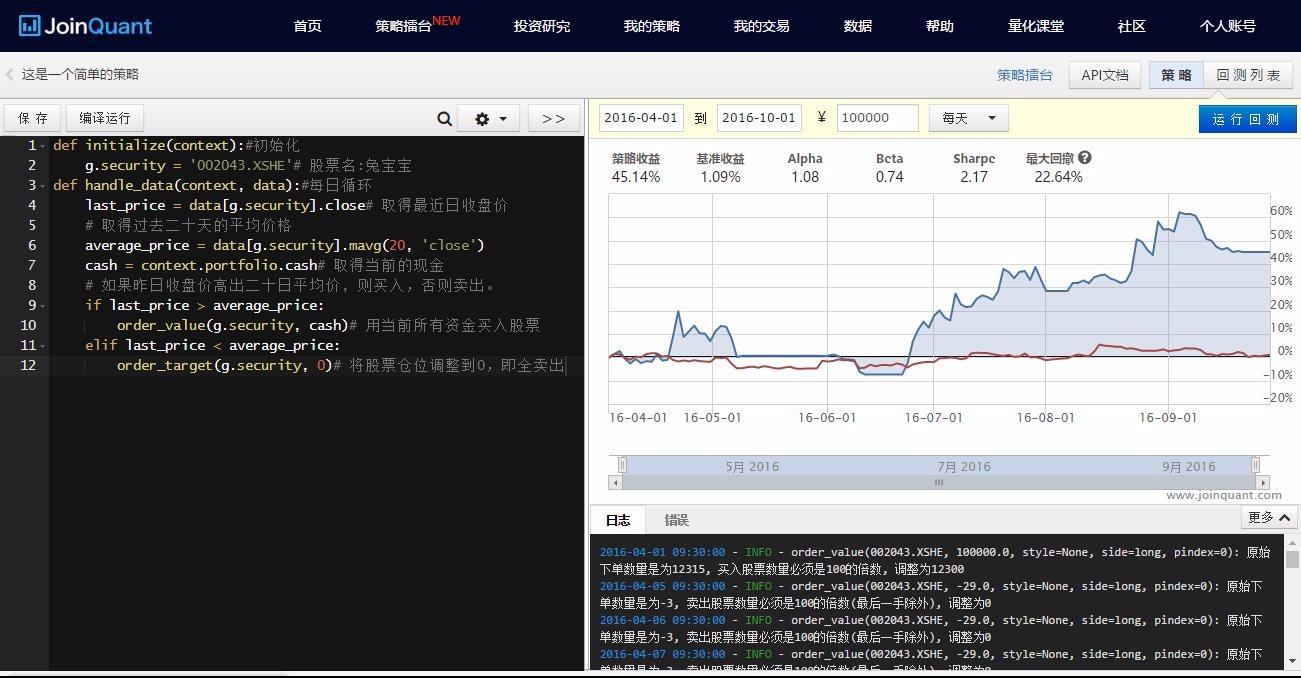 - 什么是回测?回测是量化交易策略研究中的关键,是指给定一段时间的历史数据(如此处是20140101到20160601的每日数据),计算机按照所编写的策略进行模拟仿真交易,以测试策略效果好坏。