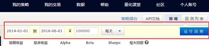现在,在策略回测界面右上部,设置回测时间从20140101到20160601,设置初始资金100000,设置回测频率,然后点击运行回测。