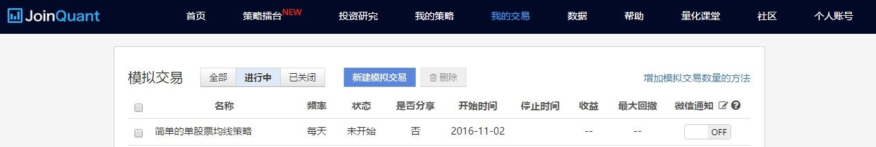 点击聚宽导航栏我的交易,可以看到创建的模拟交易,如下图。