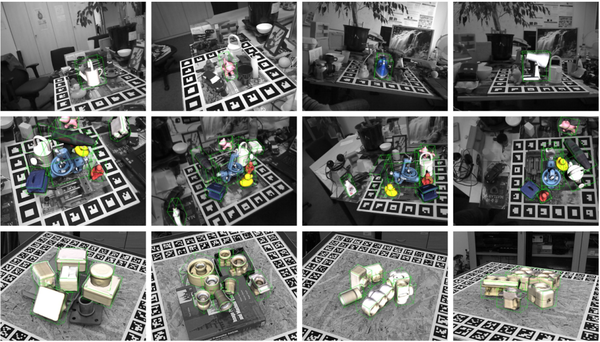 (4)所提出的方法对BOP基准数据集的场景的影响。场景RGB数据以灰色显示, 对象模型以颜色和绿色包围框内显示。